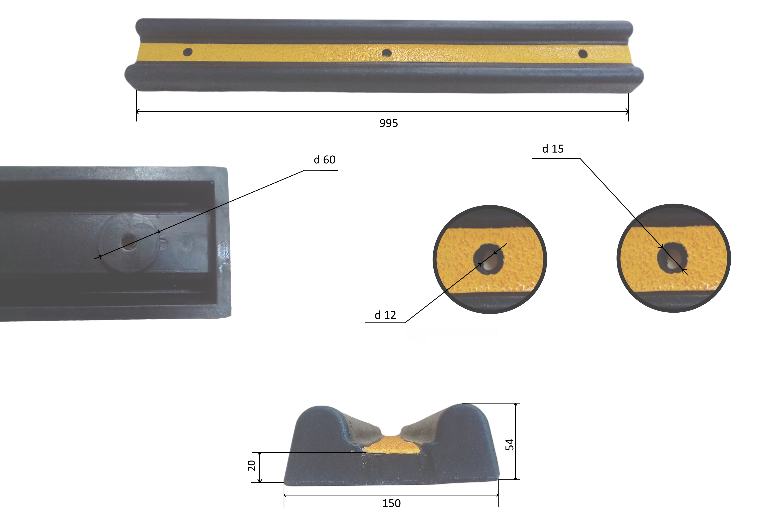 Materiaali iskunkestävää kumia. Pituus 1000mm, leveys 150mm, paksuus 54mm. Käyttölämpötila -50C – +60C astetta. Paino 5,0kg. Joustava, kimmoista, kestää paljon hankausta. Varustettu vahvoilla 3M heijastimilla.